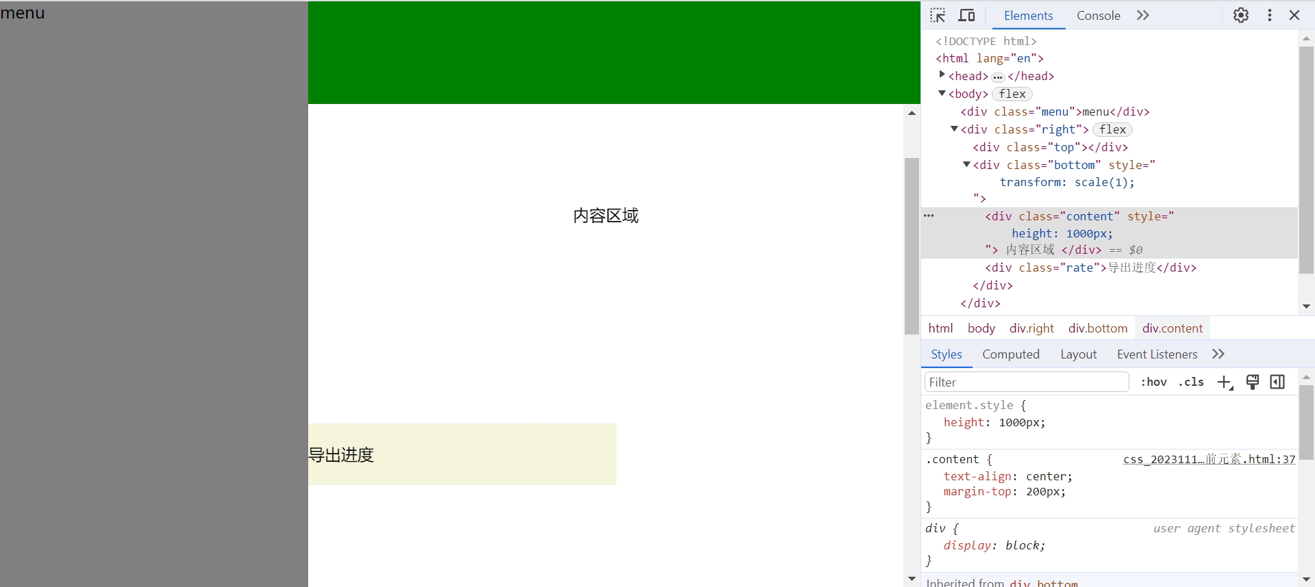 但是当 .content 区域长度很长,产生滚动条时,滚动条向下时 导出进度 区域也会跟着滚动。这个地方困扰了很久,试了很多办法。